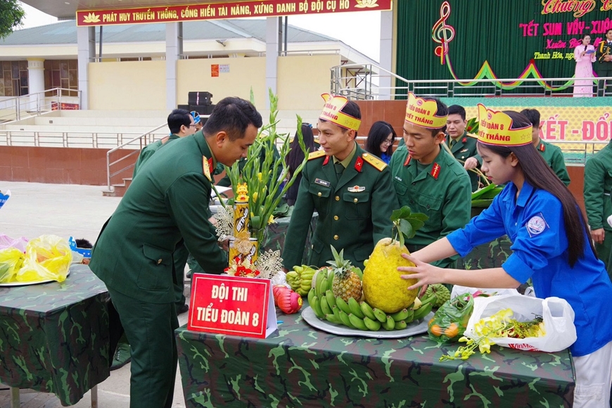 Tạm biệt những chiến sĩ canh trời, chúng tôi đến với cán bộ, chiến sĩ Tiểu đoàn 9 để hòa mình trong các hoạt động vui Tết, đón Xuân của đơn vị. Điều ấn tượng với chúng tôi là những gam màu rực rỡ của băng rôn, biểu ngữ và cảnh sắc đơn vị. Những vườn bắp cải, súp lơ xanh mướt xen lẫn những luống rau cải đang kỳ trở hoa khiến khu tăng gia sản xuất của đơn vị trong thật lung linh. Trên sân chào cờ tiểu đoàn, đang diễn ra hội thi cắm hoa nghệ thuật và gói bánh chưng, trưng bày mâm ngũ quả. Những bàn tay “nghệ nhân” chiến sĩ vốn quen với việc cầm súng, huấn luyện võ thuật nhưng hôm nay thật mềm mại, khéo léo. Những lọ hoa, những mâm ngũ quả… có thêm sự tham gia của các bạn đến từ đơn vị kết nghĩa trông thật duyên dáng.