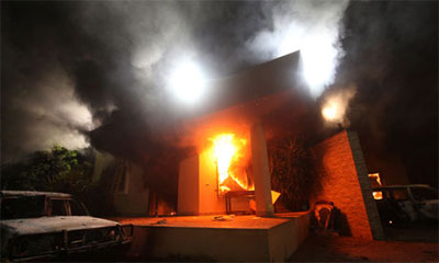 Lãnh sự quán Mỹ tại Li-bi bị tấn công ngày 11-9-2012. Ảnh: Roi-tơ.