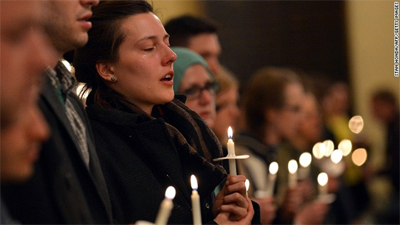 Nước mắt lăn dài trên má cô gái trong lễ cầu nguyện tại một nhà thờ để tưởng niệm các nạn nhân. Ảnh: CNN