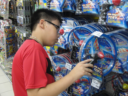 Cậu bé Trần Hoàng Long (Đồng Văn, Duy Tiên, Hà Nam) mê mẩn trước những đĩa bay TOSY, sản phẩm đồ chơi do người Việt Nam sáng tạo và sản xuất