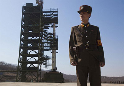 Binh sĩ Triều Tiên đứng gần một bệ phóng tên lửa. Ảnh: Roi-tơ