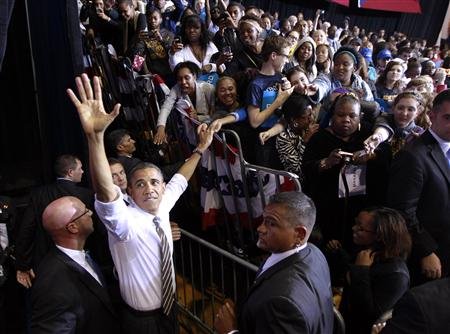 Tổng thống Ô-ba-ma chào những người ủng hộ tại Trường Đại học KentState, bang Ô-hai-ô hôm 26-9. Ảnh: AP
