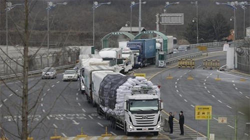 Các phương tiện của Hàn Quốc rời khỏi Khu công nghiệp Kê-xâng. Ảnh: AP