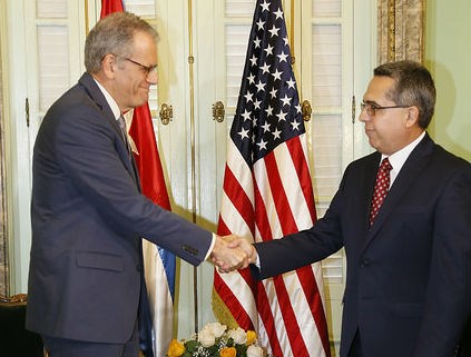 Ông Giép-phrây Đơ Lau-ren-tít (bên trái) trong cuộc gặp với Thứ trưởng Ngoại giao Cu-ba Mác-xê-li-nô Mê-đi-na (Marcelino Medina) tại La Ha-ba-na