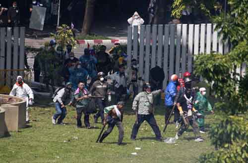 Người biểu tình chống chính phủ đụng độ với cảnh sát ở Băng Cốc ngày 26-12. Ảnh: AP