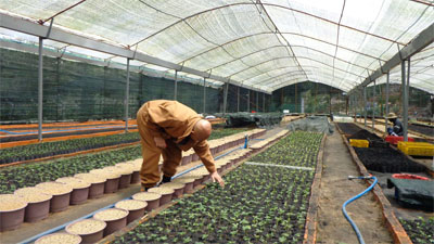 Hòa Thượng Thích Huệ Đăng đang chăm sóc vườn sâm Ngọc Linh được thực hiện bằng phương pháp nuôi cấy mô.