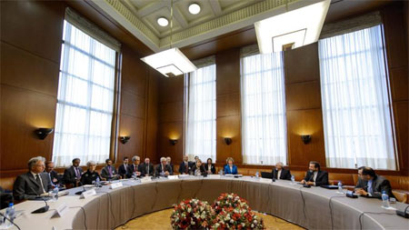 Quang cảnh ngày làm việc đầu tiên của vòng đàm phán giữa Nhóm P5+1 và I-ran. Ảnh: AP