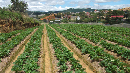 Cánh đồng dâu tây giống phát triển rất tốt, cho năng suất cao, đang được trồng tại huyện Đơn Dương.