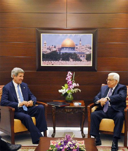 Ngoại trưởng Mỹ G. Ke-ri (bên trái) trong cuộc gặp với Tổng thống Pa-le-xtin M. Áp-bát ngày 19-7 tại Bờ Tây. Ảnh: AP