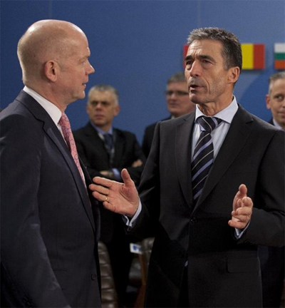 Tổng Thư ký NATO Ra-xmút-xen (bên phải) trong cuộc họp ngày 4-12 ở Brúc-xen. Ảnh: AFP