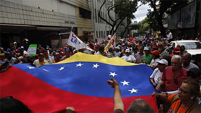 Những người ủng hộ Tổng thống N.Ma-đu-rô tổ chức tuần hành hòa bình tại Ca-ra-cát ngày 23-2. Ảnh: Roi-tơ.