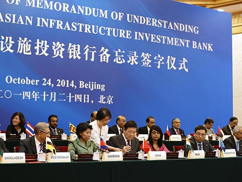 Lễ ký bản ghi nhớ về việc thành lập Ngân hàng đầu tư hạ tầng châu Á (AIIB) tại Bắc Kinh - Trung Quốc vào ngày 24-10 vừa qua. Ảnh: Reuters.