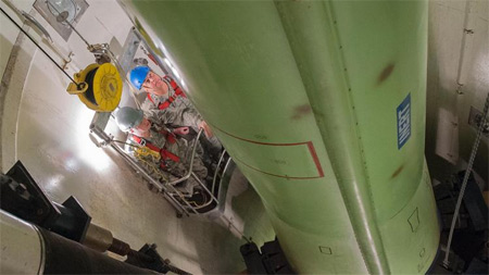 | Tham mưu trưởng Không quân Mỹ Mác Oen-sơ (bên phải) cùng một sĩ quan huấn luyện bảo trì tên lửa tại căn cứ không quân Malmstrom. Nguồn: AP |