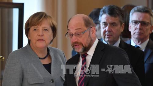 Thủ tướng Đức, người đứng đầu liên minh CDU/CSU, bà Angela Merkel (trái) và lãnh đạo SPD Martin Schulz tại Berlin ngày 9-1. Ảnh: TTXVN |