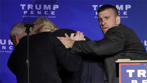 Khoảnh khắc ông Đô-nan Trăm được hai nhân viên an ninh hộ tống vào phía sau khán đài. Ảnh: AP