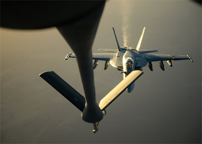 Máy bay chiến đấu F-18E Super Hornet của Mỹ được tiếp nhiên liệu trên không sau khi không kích. Ảnh: AP