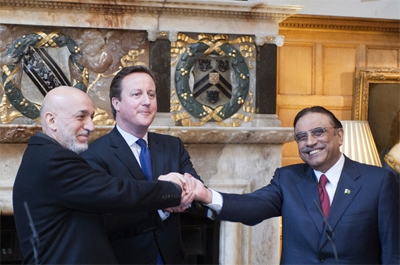 Tổng thống Áp-ga-ni-xtan H. Ca-dai (trái), Thủ tướng Anh Đ. Ca-mê-rôn (giữa) và Tổng thống Pa-ki-xtan Da-đa-ri tại Hội nghị thượng đỉnh ba bên: Anh, Áp-ga-ni-xtan và Pa-ki-xtan diễn ra ở Luân Đôn hồi tháng 2. Ảnh: AP