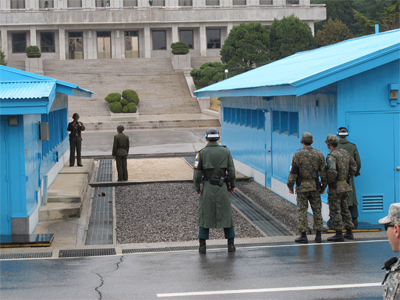 Nhưng không khí tại Bàn Môn Điếm khá bình lặng. Đứng trước khu vực an ninh chung với những tòa nhà xanh được xây chính giữa đường biên giới (một nửa ngôi nhà nằm trên đất CHDCND Triều Tiên và nửa còn lại nằm trên đất Hàn Quốc) vốn được dùng làm nơi gặp gỡ giữa 2 bên, trong khi chúng tôi hướng máy ảnh sang phía Bắc tác nghiệp, thì bên phía đối diện, hai sĩ quan CHDCND Triều Tiên cũng tiến ra tận sát đường biên là gờ xi măng giữa hai tòa nhà để chụp ảnh kỷ niệm. Mọi việc diễn ra một cách tự nhiên, không có điều gì căng thẳng, dù ai cũng biết là không thể thò chân sang bên kia gờ xi măng, dù chỉ 1cm.