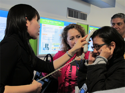 Các phóng viên đang được giới thiệu sử dụng loại điện thoại có thể nghe bằng đầu tại Viện Nghiên cứu điện tử và viễn thông