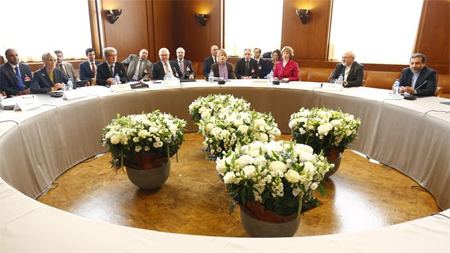 Quang cảnh ngày đàm phán đầu tiên về chương trình hạt nhân của I-ran tại Giơ-ne-vơ hôm 7-11. Ảnh: Roi-tơ
