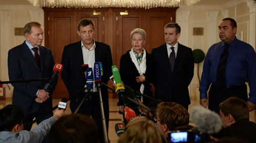 | Các bên tham gia cuộc họp tại Min-xcơ (Bê-la-rút) ra tuyên bố chính thức về việc ký kết thỏa thuận ngừng bắn ở U-crai-na. Ảnh: AP |