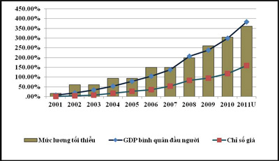 Tốc độ tăng lương tối thiểu so sánh với tốc độ tăng giá và tốc độ tăng GDP bình quân đầu người. Biểu đồ được lập theo số liệu của Tổng cục Thống kê, năm 2011.