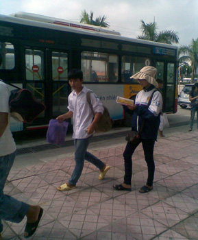 Đối tượng nữ đang chèo kéo khách mua tăm theo kiểu... mua từ thiện tại bến xe Yên Nghĩa