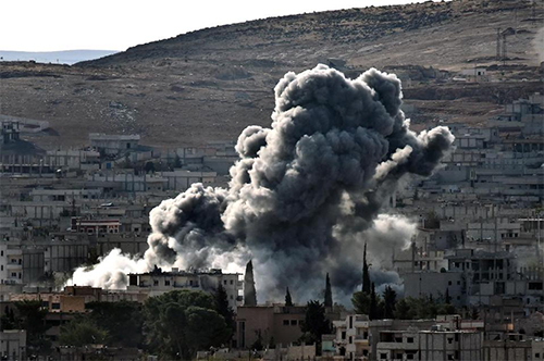 Khói bốc lên tại thị trấn Cô-ba-ni sau một đợt không kích của liên quân quốc tế ngày 15-10. Ảnh: AFP