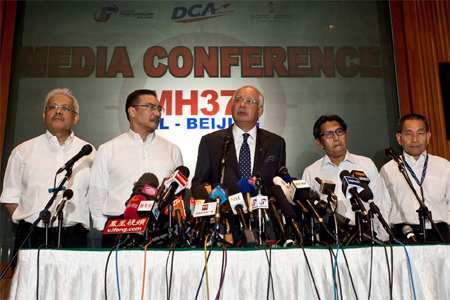 Phát biểu tại cuộc họp báo, Thủ tướng Na-gíp Ra-dắc cho biết chưa có bằng chứng cuối cùng để khẳng định rằng, chiếc máy bay bị không tặc. Tuy nhiên, các cơ quan có thẩm quyền của Ma-lai-xi-a và các đối tác nước ngoài đều nhất trí rằng, chiếc máy bay đã quay trở lại từ vị trí cuối cùng được lưu lại trên ra-đa dân sự và tín hiệu mà ra-đa quân sự Ma-lai-xi-a bắt được tại khu vực phía Bắc của eo biển Ma-lắc-ca là từ chiếc máy bay mất tích. Ngoài ra, Thủ tướng Na-gíp Ra-dắc cũng cho biết thêm chiếc máy bay tiếp tục bay thêm 6 tiếng nữa sau khi mất tích khỏi màn hình ra-đa dân sự. Ông Na-gíp Ra-dắc cho biết có thể máy bay đã di chuyển theo hai hướng sau khi biến mất, một là hướng Bắc từ Thái Lan tới biên giới Ca-dắc-xtan và Tuốc-mê-ni-xtan, hoặc hướng Nam từ In-đô-nê-xi-a tới Ấn Độ Dương. Hiện nhà chức trách Ma-lai-xi-a đã quyết định ngừng hoạt động tìm kiếm tại Biển Đông và tập trung các nỗ lực tìm kiếm sang Ấn Độ Dương.