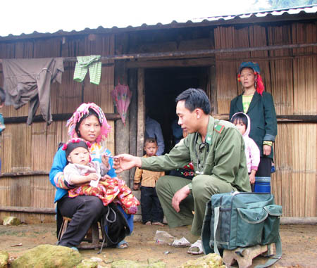 Cán bộ quân y của Đồn Biên phòng 309 Pa Ủ, Mường Tè, Lai Châu tuyên truyền công tác DS-KHHGĐ cho bà con. Ảnh: Trường Giang