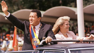 | Tổng thống Chavez và vợ - bà Marisabel Rodriguez de Chavez - vẫy tay chào người ủng hộ trong cuộc diễu hành ngày 4-2-1999. Trước đó 2 ngày, ông Chavez đã tuyên thệ nhậm chức Tổng thống Venezuela. Ảnh: Getty |