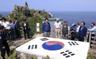 Tổng thống Hàn Quốc Li Miêng Pắc trong chuyến thăm quần đảo tranh chấp Đốc-đô/Ta-kê-si-ma. Ảnh: AP