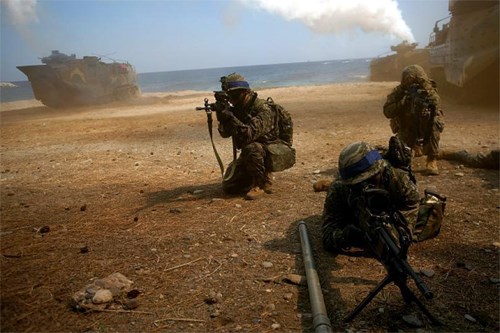 Lính Mỹ trong cuộc diễn tập đổ bộ “Ssangyong” trên bãi biển ngày 12-3. Ảnh: Getty Images.