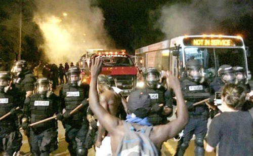 Cảnh sát ở thành phố Sác-lốt đang ngăn chặn người biểu tình. Ảnh: CNN