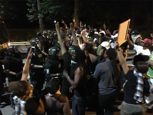 Theo Cảnh sát trưởng thành phố Sác-lốt Cơ Pút-ni (Kerr Putney), tình hình thực địa vẫn đang rất căng thẳng khi đám đông người biểu tình ngày càng trở nên quá khích, liên tục ném chai lọ về phía lực lượng an ninh. Một cảnh sát đã bị thương và đang được điều trị tại bệnh viện. Thống đốc Pát Mắc Crô-ri cho biết, ông đã quyết định tuyên bố tình trạng khẩn cấp sau khi đám đông nổi loạn tấn công các nhà báo và những người khác, đập phá cửa sổ và gây ra các đám cháy nhỏ.
