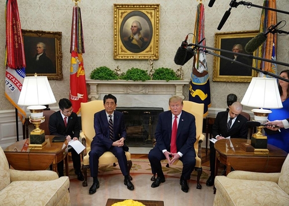 Ông Donald Trump và ông Shinzo Abe gặp nhau tại Phòng Bầu dục ở Nhà Trắng. Ảnh: AFP