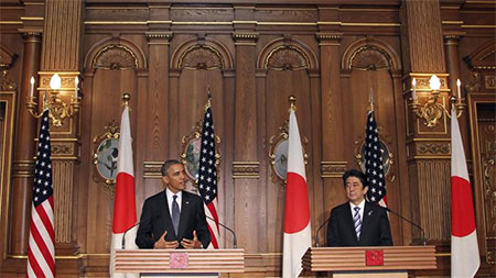 Nhật Bản là chặng dừng chân đầu tiên trong chuyến công du châu Á nhằm thúc đẩy cam kết của Oa-sinh-tơn đối với khu vực này. Đây cũng là chuyến thăm cấp nhà nước đầu tiên của một tổng thống Mỹ đến Nhật Bản kể từ năm 1996. Phát biểu tại buổi họp báo chung sau cuộc hội đàm với Thủ tướng Sin-dô A-bê, ông B.Ô-ba-ma nhấn mạnh liên minh Mỹ-Nhật là nền tảng không chỉ đối với an ninh của Mỹ ở châu Á-Thái Bình Dương mà còn đối với toàn khu vực. Thủ tướng Nhật Bản cũng khẳng định Nhật Bản ủng hộ mạnh mẽ chính sách tái cân bằng chiến lược của Mỹ sang châu Á, đồng thời cũng nhấn mạnh vai trò "không thể thiếu và không thể thay thế" của liên minh Nhật-Mỹ đối với hòa bình khu vực.