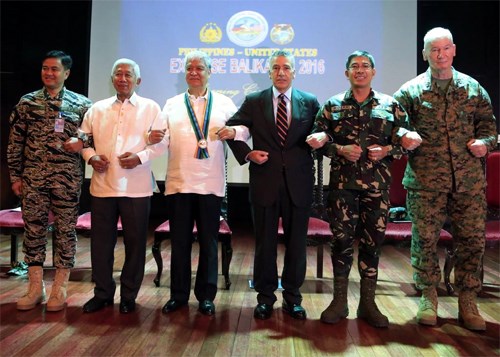 Các quan chức quân đội cấp cao Phi-líp-pin và Mỹ tại lễ khai mạc cuộc tập trận Balikatan 2016. Ảnh:Philstar.com
