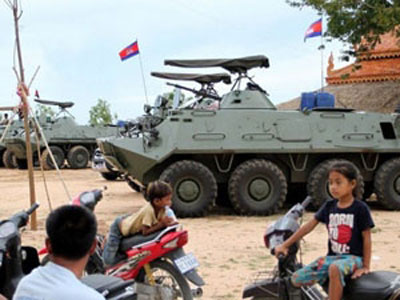 Xe bọc thép được điều đến thủ đô Phnom Penh đề phòng bạo động phản đối kết quả bầu cử. (Ảnh: AFP)