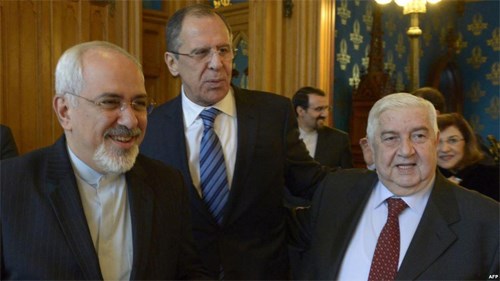 Ngoại trưởng Nga (giữa), I-ran (trái) và Xy-ri trong cuộc gặp tại Mát-xcơ-va. Ảnh: AFP