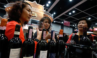 Khách hàng Trung Quốc nếm thử rượu vang châu Âu tại một hội chợ thương mại quốc tế. Ảnh: AP.