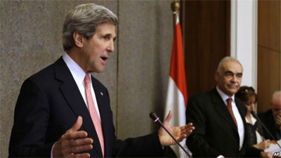 Ngoại trưởng Ke-ri (bên trái) và người đồng cấp Ai Cập Ca-men Am trong cuộc họp báo chung ở Cai-rô ngày 2-3. Ảnh: Roi-tơ.