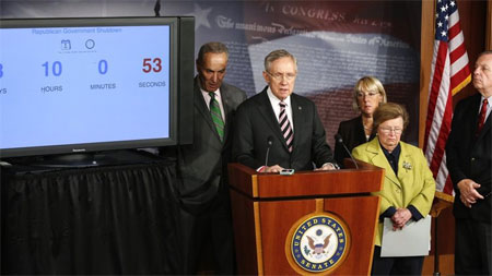 Chủ tịch Thượng viện Ha-ri Rết (Harry Reid) phát biểu tại một cuộc họp báo sau khi Thượng viện bỏ phiếu thông qua dự luật ngân sách tạm thời. Ảnh: Roi-tơ