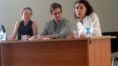 E.Xnâu-đơn gặp gỡ một số phóng viên tại sân bay Nga cho biết quyết định xin tị nạn tạm thời tại Nga. Ảnh: AP