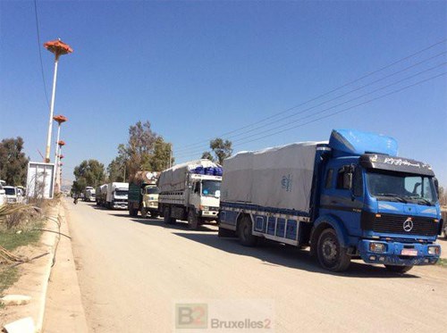 Các đoàn xe chở hàng cứu trợ quốc tế đã tới tỉnh Hôm-xơ của Xy-ri. Ảnh: bruxelles2.eu