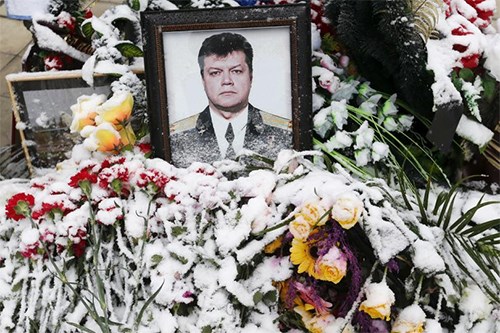 Ảnh chân dung phi công Nga Ô.Pê-sơ-cốp được phủ đầy hoa ở Li-pét-xcơ, Nga. Ảnh: Roi-tơ