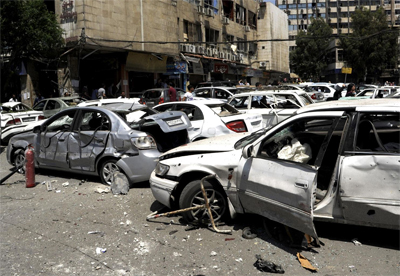 Hiện trường vụ đánh bom tại thủ đô Đa-mát ngày 30-4. Ảnh: AP