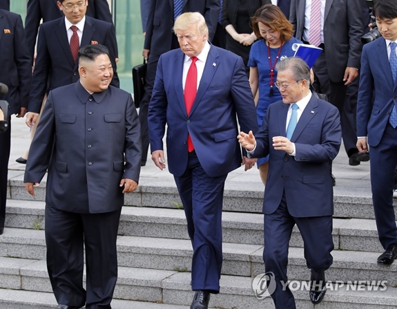 Từ trái qua phải: Nhà lãnh đạo Triều Tiên Kim Jong-un, Tổng thống Mỹ D.Trump và Tổng thống Hàn Quốc Moon Jae-in gặp gỡ tại DMZ, ngày 30-6. Ảnh: Yonhap |