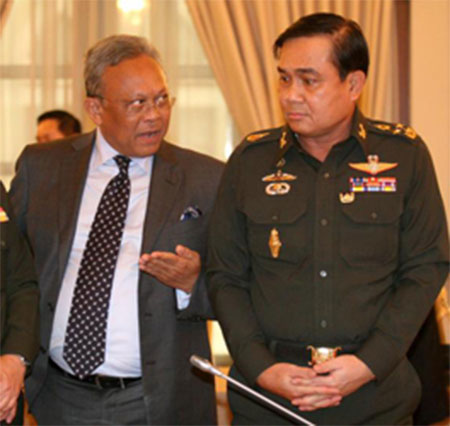 Cuộc gặp giữa Tướng Tha-na-xắc Pa-ti-ma-pra-côn (bên phải) và ông Xu-thép được hy vọng sẽ tìm ra giải pháp chấm dứt khủng hoảng ở Thái Lan.Ảnh: Bangkokpost.com