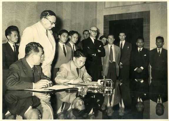 Thứ trưởng Bộ Quốc phòng Tạ Quang Bửu thay mặt Chính phủ Việt Nam Dân chủ cộng hòa ký Hiệp định Geneve về đình chỉ chiến sự ở Việt Nam, ngày 20-7-1954. Ảnh tư liệu. |